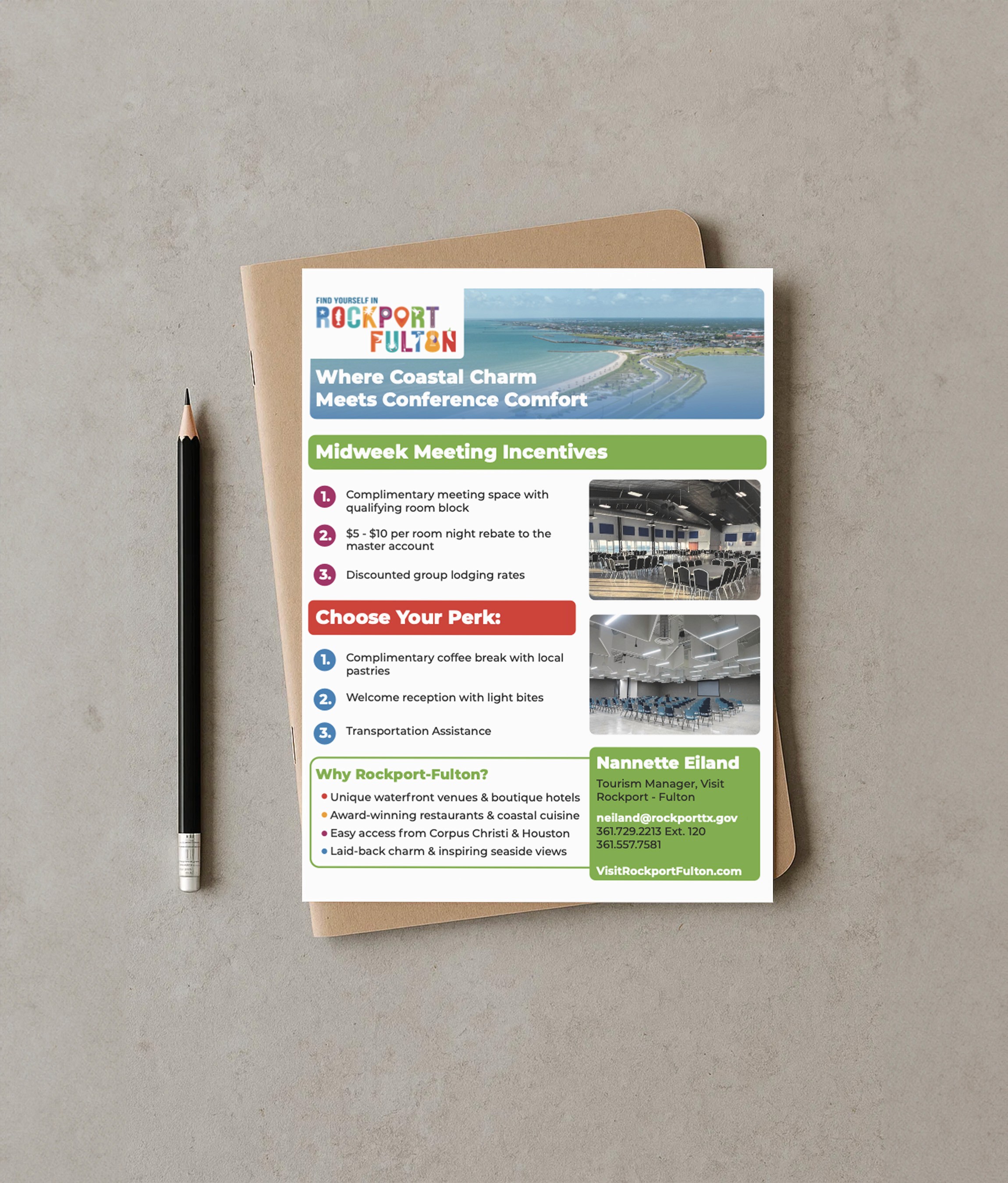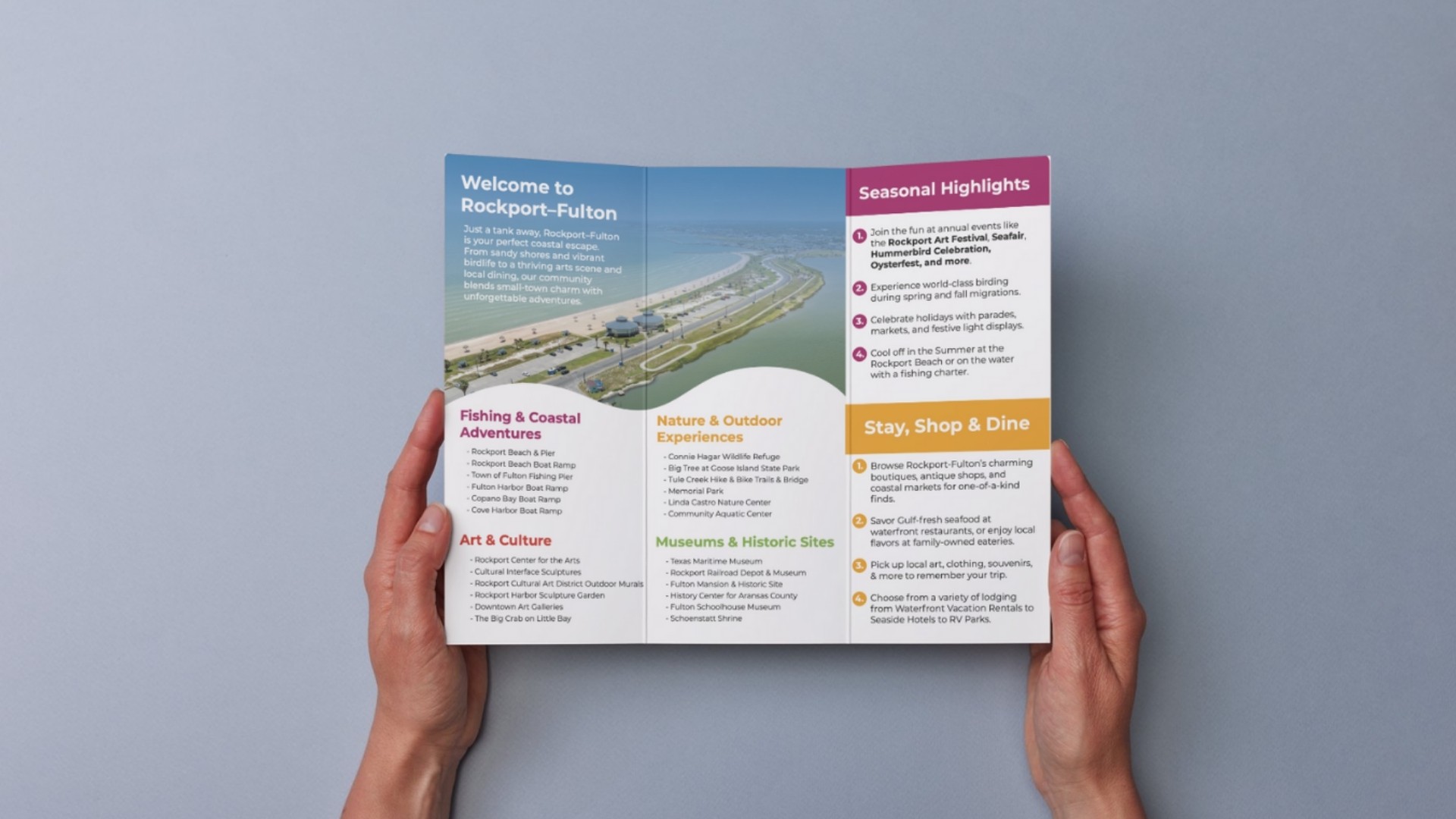 Visit Rockport-Fulton needed collateral that worked as hard as their small team—materials that could guide visitors, support meeting planners, and represent the destination without requiring constant updates or redesign.
